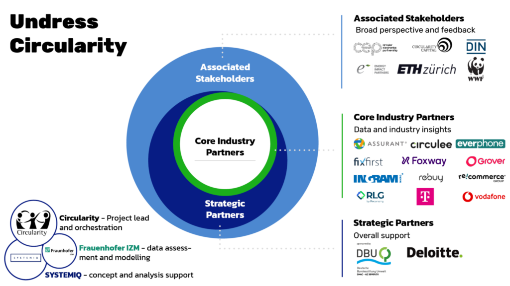 The „Undress Project“, implemented and led by Circularity in collaboration with Systemiq and Fraunhofer IZM and 12 industry partners, and supported by Deutsche Bundesstiftung Umwelt and Deloitte, sets out to develop a methodological framework and practical guide to assess the environmental impact of circular business models for the case of consumer electronics. This project will provide much-needed key insights for the transition to a truly sustainable circular economy, with the electronics sector leading the way.